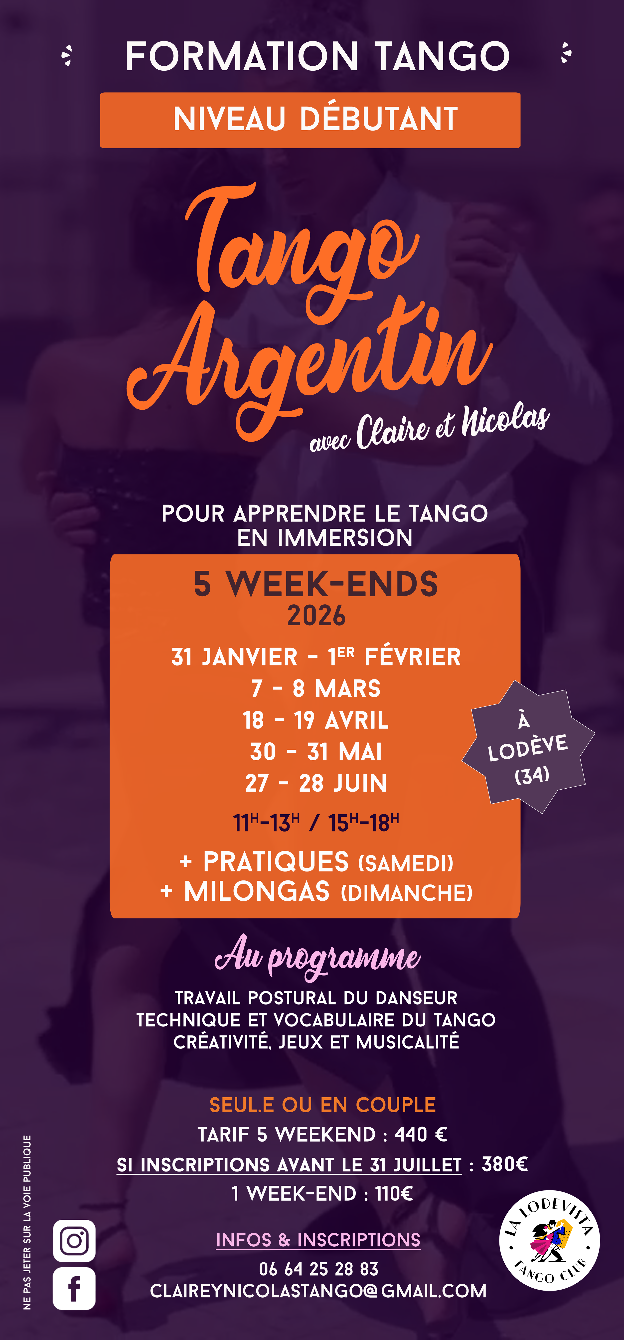 Horaires : 11h-13h // 15h-18h // Pratique Samedi 18h-20h Milonga Dimanche 18h30-21h30 // Repas en Auberge Espagnole